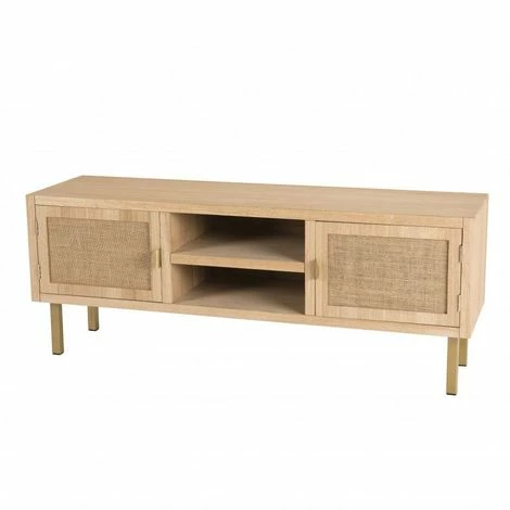 Meuble TV 2 niches 2 portes toile de jute pieds métal doré. Dimensions : 120 x 34 x 46,5 cm. Article en MDF plaqué frêne et Toile de jute. Découvrez cette collection sans plus attendre, son bois clair apaisant et son tissage naturel sont parfaits pour passer de bons moments dans un intérieur chaleureux. Ce joli meuble TV apportera de la luminosité à votre pièce. Composé de 2 niches et de 2 portes, vous pourrez aisément disposer et ranger vos objets. Le bois clair et la toile de jute s’accordent parfaitement et créer un ensemble harmonieux. Ses petites touches de métal doré lui donnent un côté original et unique. Meuble monté, pieds à visser
