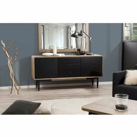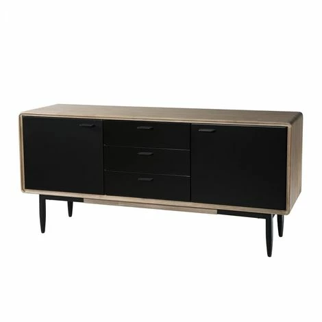Buffet 3 tiroirs 2 portes bois chĂŞne et mĂ©tal noir. Dimensions : 160 x 45 x 75 cm. Article en Acacia et Acier. L’Ă©lĂ©gance dans toute sa splendeur avec cette gamme très chic qui marie l’industriel avec le scandinave. Meuble montĂ©
