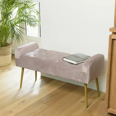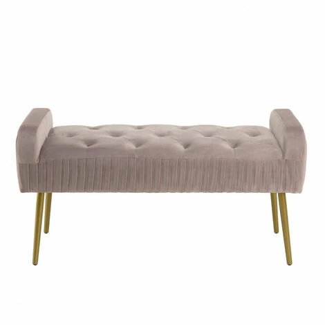 Banc de lit velours rose poudré pieds métal doré. Dimensions : 103 x 40 x 53 cm. Article en Velours Polyester/ Mousse /Acier/ Contreplaqué. Laissez-vous séduire par ce magnifique banc de lit en velours rose poudré. Son allure féminine est très élégante et apportera de la fraîcheur à l’ensemble de la pièce. Vous pourrez le disposer dans une chambre, un dressing ou même un bureau. Cet article vintage offre une jolie assise confortable grâce au capitonnage qui fait toute la différence ! Meuble monté, pieds à visser