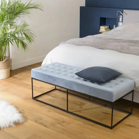 Banc en velours bleu clair capitonné structure métal noir. Dimensions : 120 x 47 x 42 cm. Article en Velours / Mousse / Acier. Le confort est votre priorité ? Ce banc de lit va donc vous convenir… Sa matière douce et moelleuse fera votre bonheur au quotidien ! Doté d’une structure en métal noir et d’une assise de couleur bleu clair, le mélange de matières est très joli et convient à tout type de décoration. Meuble monté