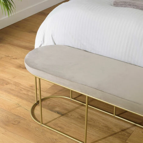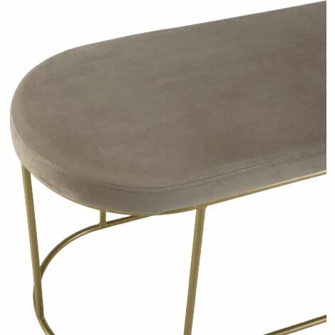 Banc velours gris taupe pieds arrondis métal doré. Dimensions : 105 x 36 x 42 cm. Article en Velours Polyester / Mousse / Acier / Contreplaqué. Craquez pour ce joli banc en velours et son piètement en métal doré ! Son assise en velours offre une assise douce et confortable. Ses formes arrondies le rendent tendance et font toute la différence. Meuble monté
