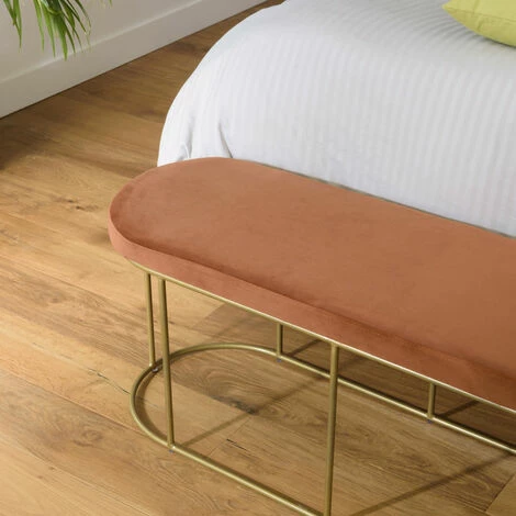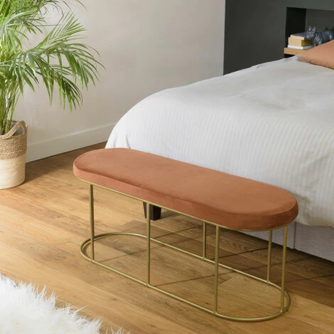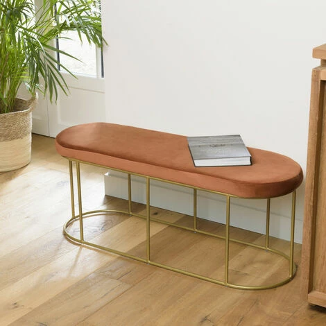 Banc velours orange pieds arrondis métal doré. Dimensions : 105 x 36 x 42 cm. Article en Velours Polyester / Mousse / Acier / Contreplaqué. Créez une atmosphère chaleureuse dans votre pièce ! Ce banc de lit en velours est idéal pour donner du cachet à votre intérieur. Son assise est élégante et confortable grâce à la douceur du velours. Ses pieds en métal doré ajoutent un côté chic à ce meuble qui vous séduira en un clin d’œil… Meuble monté