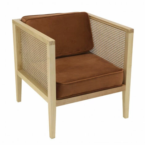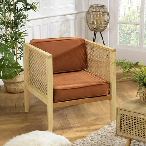 MACABANE ALBANE – Fauteuil Cannage Assise Amovible Velours Orange – Orange / Bois Naturel