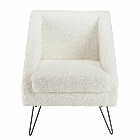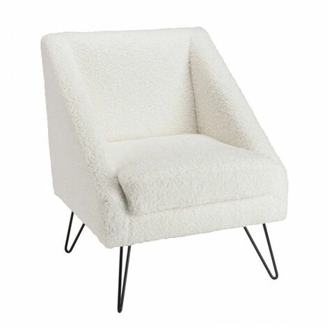 Fauteuil tissu bouclette blanc pieds épingles métal noir. Dimensions : 62 x 69 x 76.5 cm. Article en Tissu fausse fourrure/Métal. Profitez de ce fauteuil pour vous détendre confortablement… Il associe parfaitement un tissu bouclette blanc et des pieds épingles en métal noir pour un ensemble tendance. Son gros coussin moelleux sera votre meilleur allié au quotidien ! Meuble monté, pieds à visser