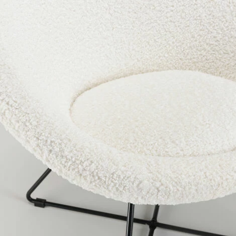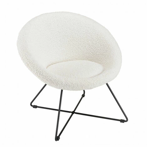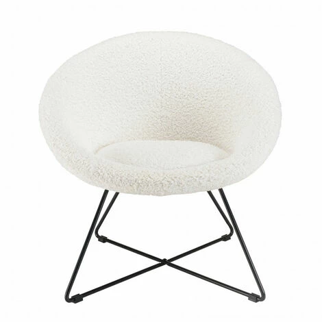 Fauteuil tissu bouclette blanc pieds croisés métal noir. Dimensions : 72 x 62 x 71 cm. Article en Tissu fausse fourrure/Métal. Ce beau fauteuil aux pieds croisés donnera un style cosy à votre intérieur ! Sa forme ronde est idéale pour se reposer puisqu’elle offre une assise confortable. Dans une chambre, un salon ou un bureau, vous pourrez créer un coin détente et en profiter au quotidien. Meuble monté, pieds à visser