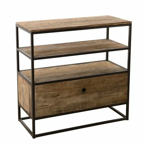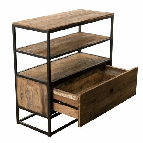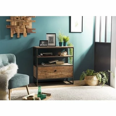 Étagère marron 1 tiroir Teck recyclĂ© Acacia Mahogany et mĂ©tal noir. Dimensions : 90 x 40 x 91 cm. Article en Teck recyclĂ© et Acacia, Mahogany recyclĂ©. Cet article est composĂ© de bois recyclĂ© ! Le bois recyclĂ© est un bois rĂ©cupĂ©rĂ© de vieilles charpentes, de coques de bateaux ou tout bois de rĂ©cupĂ©ration ayant dĂ©jĂ eu une longue vie. C’est ce qui lui donne cet aspect vieilli et authentique avec ses imperfections qui font tout son charme.  AcquĂ©rir du bois recyclĂ© est une initiative Ă©coresponsable qui permet de lutter contre la dĂ©forestation. Meuble montĂ©