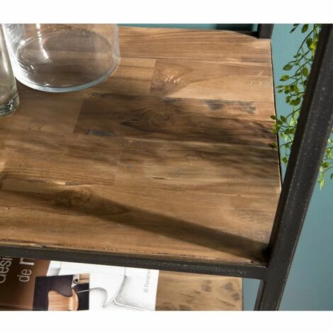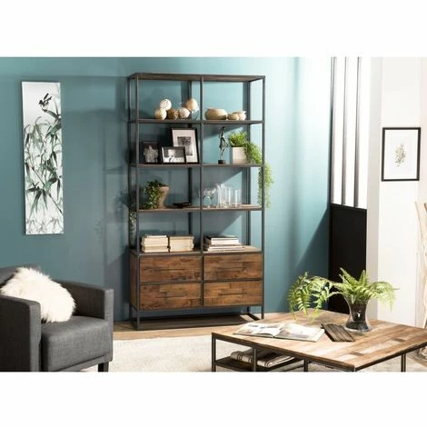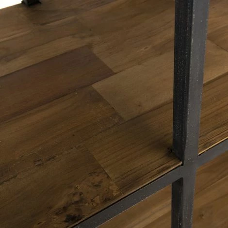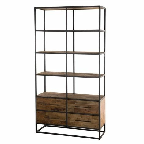 Étagère marron 4 niveaux 4 tiroirs Teck recyclé et métal noir. Dimensions : 110 x 40 x 210 cm. Article en Teck recyclé et Métal. Cet article est composé de bois recyclé ! Le bois recyclé est un bois récupéré de vieilles charpentes, de coques de bateaux ou tout bois de récupération ayant déjà eu une longue vie. C’est ce qui lui donne cet aspect vieilli et authentique avec ses imperfections qui font tout son charme. Acquérir du bois recyclé est une initiative écoresponsable qui permet de lutter contre la déforestation. Meuble monté