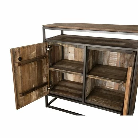 Buffet 2 portes et 1 étagère Teck recyclé Acacia Mahogany recyclé et métal noir. Dimensions : 90 x 40 x 90,5 cm. Article en Teck recyclé et Acacia, Mahogany recyclé. Cet article est composé de bois recyclé ! Le bois recyclé est un bois récupéré de vieilles charpentes, de coques de bateaux ou tout bois de récupération ayant déjà eu une longue vie. C’est ce qui lui donne cet aspect vieilli et authentique avec ses imperfections qui font tout son charme. Acquérir du bois recyclé est une initiative écoresponsable qui permet de lutter contre la déforestation. Meuble monté