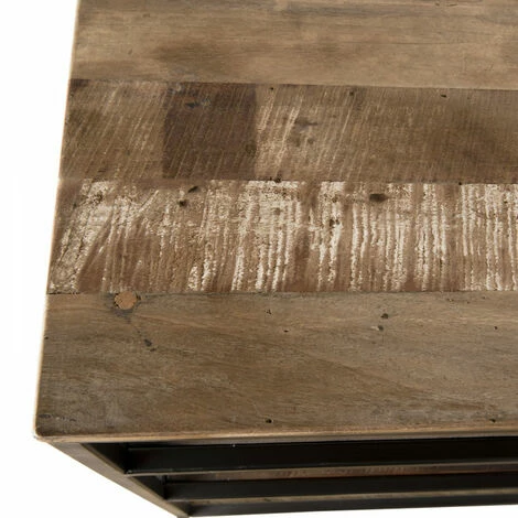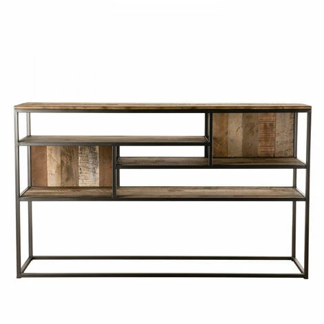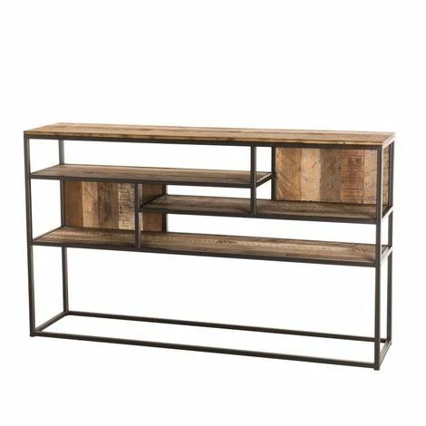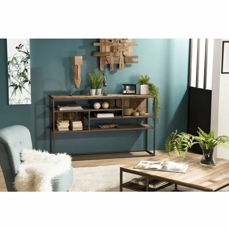 Console marron 4 niveaux Teck recyclé Acacia Mahogany recyclé et métal noir. Dimensions : 150 x 35 x 91 cm. Article en Teck recyclé et Acacia, Mahogany recyclé. Cet article est composé de bois recyclé ! Le bois recyclé est un bois récupéré de vieilles charpentes, de coques de bateaux ou tout bois de récupération ayant déjà eu une longue vie. C’est ce qui lui donne cet aspect vieilli et authentique avec ses imperfections qui font tout son charme. Acquérir du bois recyclé est une initiative écoresponsable qui permet de lutter contre la déforestation. Meuble monté
