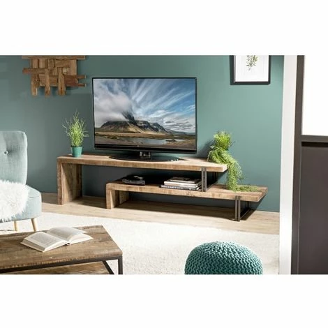 Meuble TV marron 2 niveaux Teck recyclé Acacia Mahogany recyclé et métal noir. Dimensions : 160 x 40 x 45 cm. Article en Teck recyclé et Acacia, Mahogany recyclé. Cet article est composé de bois recyclé ! Le bois recyclé est un bois récupéré de vieilles charpentes, de coques de bateaux ou tout bois de récupération ayant déjà eu une longue vie. C’est ce qui lui donne cet aspect vieilli et authentique avec ses imperfections qui font tout son charme. Acquérir du bois recyclé est une initiative écoresponsable qui permet de lutter contre la déforestation. Meuble monté