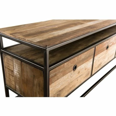 Meuble TV marron 3 tiroirs Teck recyclé Acacia Mahogany recyclé et métal noir. Dimensions : 150 x 40 x 55 cm. Article en Teck recyclé et Acacia, Mahogany recyclé. Cet article est composé de bois recyclé ! Le bois recyclé est un bois récupéré de vieilles charpentes, de coques de bateaux ou tout bois de récupération ayant déjà eu une longue vie. C’est ce qui lui donne cet aspect vieilli et authentique avec ses imperfections qui font tout son charme. Acquérir du bois recyclé est une initiative écoresponsable qui permet de lutter contre la déforestation. Meuble monté