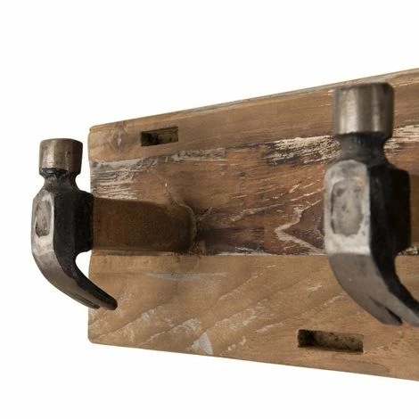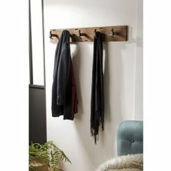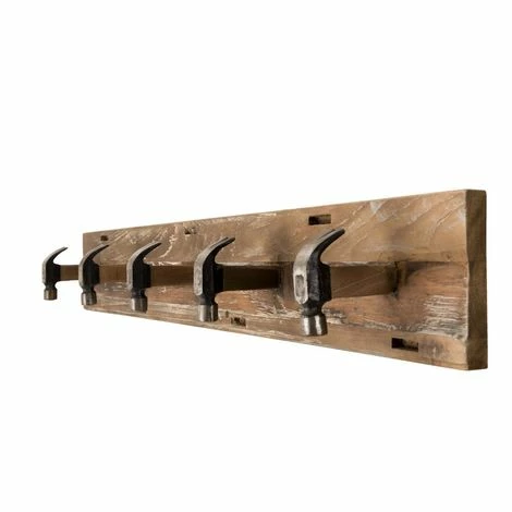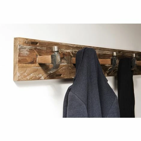 Portemanteau mural marron 5 crochets marteaux teck recyclé et métal. Dimensions : 100 x 13 x 15 cm. Article en Teck recyclé et Métal. Cet article est composé de bois recyclé ! Le bois recyclé est un bois récupéré de vieilles charpentes, de coques de bateaux ou tout bois de récupération ayant déjà eu une longue vie. C’est ce qui lui donne cet aspect vieilli et authentique avec ses imperfections qui font tout son charme. Acquérir du bois recyclé est une initiative écoresponsable qui permet de lutter contre la déforestation. Meuble monté