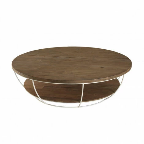MACABANE ALIDA – Table Basse Coque Ronde 120x120cm Double Plateau Teck Recyclé Métal Blanc – Brun