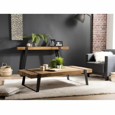 Table basse rectangulaire 140x70cm plateau teck recyclé pieds inclinés métal noir. Dimensions : 140 x 71 x 35 cm. Article en Teck recyclé et Métal. Cet article est composé de bois recyclé ! Le bois recyclé est un bois récupéré de vieilles charpentes, de coques de bateaux ou tout bois de récupération ayant déjà eu une longue vie. C’est ce qui lui donne cet aspect vieilli et authentique avec ses imperfections qui font tout son charme. Acquérir du bois recyclé est une initiative écoresponsable qui permet de lutter contre la déforestation. Meuble monté