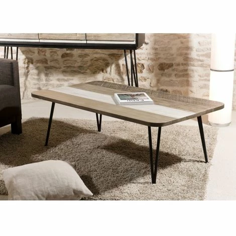 Table basse rectangulaire 120x70cm bois acacia pieds métal noir. Dimensions : 120 x 70 x 41.5 cm. Article en Acacia massif et Métal. Cet article est composé de bois d’acacia de plusieurs coloris ! Cette collection présente donc diverses teintes plus ou moins claires. Il est possible de trouver des petites imperfections ou des irrégularités puisqu’il s’agit de pièces uniques assemblées pour ne créer qu’un seul produit. Acquérir du bois recyclé est une initiative écoresponsable qui permet de lutter contre la déforestation. Son plateau aux teintes chaleureuses et variées, ses pieds fifties et son allure scandinave donnent un ensemble détonnant et unique. Votre intérieur prend à la fois du caractère mais aussi de l’élégance. Meuble monté, pieds à visser