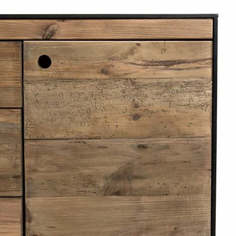 Buffet 2 portes 3 tiroirs bois Pin recyclé naturel et noir. Dimensions : 150 x 48 x 76 cm. Article en Pin recyclé/Contreplaqué. Cet article est composé de bois recyclé ! Le bois recyclé est un bois récupéré de vieilles charpentes, de coques de bateaux ou tout bois de récupération ayant déjà eu une longue vie. C’est ce qui lui donne cet aspect vieilli et authentique avec ses imperfections qui font tout son charme. Acquérir du bois recyclé est une initiative écoresponsable qui permet de lutter contre la déforestation. Ce buffet se marie avec de nombreux styles de décorations. Doté de deux portes latérales et de trois tiroirs centraux, il offre une grande capacité de rangement. Le pin recyclé naturel et noir lui donne beaucoup de cachet grâce à ses imperfections. Meuble monté