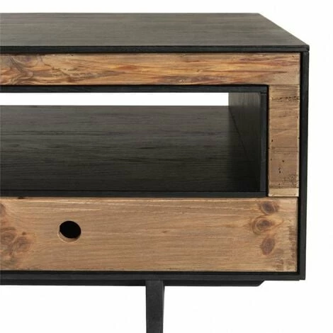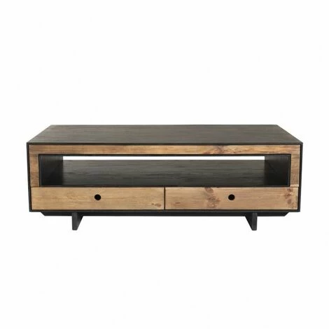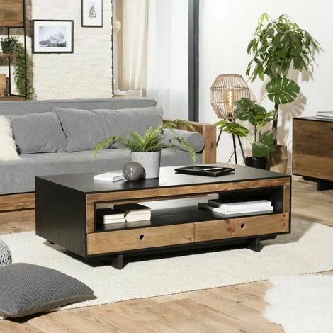 Table basse 4 tiroirs 1 niche bois Pin recyclé naturel et noir. Dimensions : 135 x 70 x 45 cm. Article en Pin recyclé/Contreplaqué. Cet article est composé de bois recyclé ! Le bois recyclé est un bois récupéré de vieilles charpentes, de coques de bateaux ou tout bois de récupération ayant déjà eu une longue vie. C’est ce qui lui donne cet aspect vieilli et authentique avec ses imperfections qui font tout son charme. Acquérir du bois recyclé est une initiative écoresponsable qui permet de lutter contre la déforestation. Cette belle table basse en pin recyclé bien pensée apportera des bonnes ondes dans votre maison. Le naturel du bois et l’élégance du noir donne du caractère à ce meuble. Dotée d’une niche traversante et de quatre tiroirs, vous pourrez l’associer à de nombreux meubles pour une décoration vintage ou bien moderne. Meuble monté