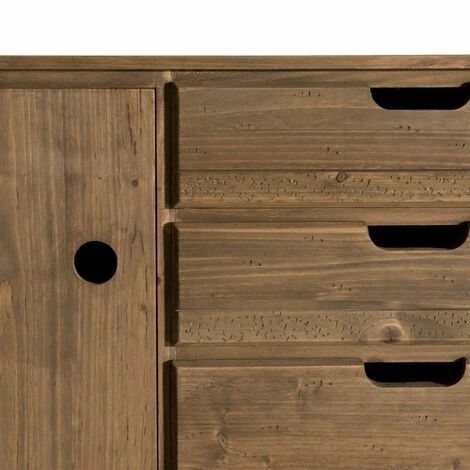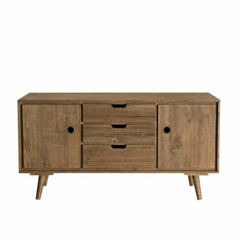 Buffet scandi marron bois 2 portes 3 tiroirs Sapin. Dimensions : 110 x 40 x 57,5 cm . Article en Sapin et fonds de tiroirs et arrière caisse en contreplaqué. Ce superbe buffet fabriqué en bois de sapin ciré apportera un côté chaleureux à votre pièce de vie et vous rapprochera de la nature grâce à son aspect cannelle vieillie. Il vous offrira un vaste choix de rangement grâce à ses trois tiroirs ainsi que ses deux portes latérales pour combler vos idées de décoration. L’aspect brut de ce bois vous fera voyager au cœur de la Scandinavie et s’accordera merveilleusement avec votre décoration. Meuble monté, pieds à visser