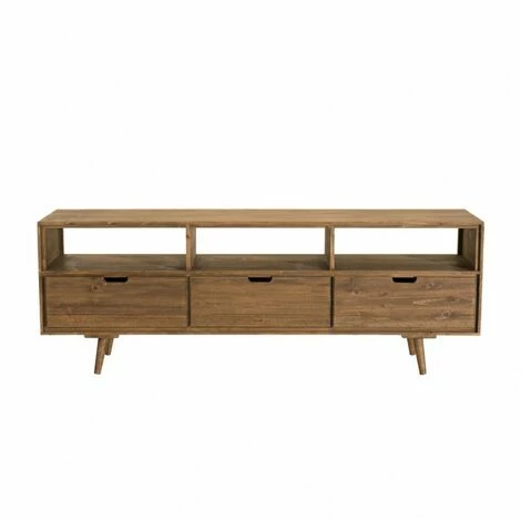 Meuble TV scandinave bois marron 3 tiroirs 3 niches Sapin. Dimensions : 165 x 40 x 60 cm . Article en Sapin et Fonds de tiroirs et arrière caisse en contreplaqué. Ce grand meuble TV en bois de sapin ciré apportera un côté chaleureux à votre pièce de vie et vous rapprochera de la nature grâce à son aspect cannelle vieillie. Celui-ci est bien pensé pour aménager agréablement votre salon et créer une atmosphère reposante dans votre intérieur. Votre télévision sera totalement harmonisée grâce à ce meuble boisé. L’aspect brut de ce bois vous fera voyager au cœur de la Scandinavie et s’accordera parfaitement avec votre décoration. Meuble monté, pieds à visser