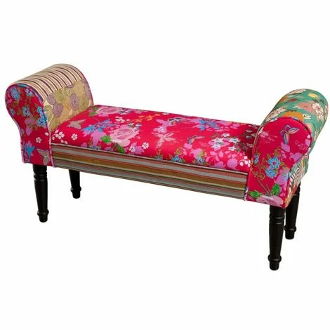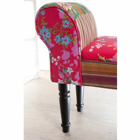 Banc de lit rectangulaire tissu bohème multicolore pieds bois noir. Dimensions : 102 x 30 x 54 cm. Article en Coton et Bouleau. Des revêtements très atypiques aux formes originales. Laissez-vous séduire par la douceur des matières. Cette collection de fauteuils et de petits tabourets s’invite chez vous ! Tout aussi approprié dans un intérieur esprit « factory » que « classique ». Ses coloris vifs et ses matières chaleureuses apportent une ambiance vivante, douce et accueillante à votre salon. Meuble monté, pieds à visser