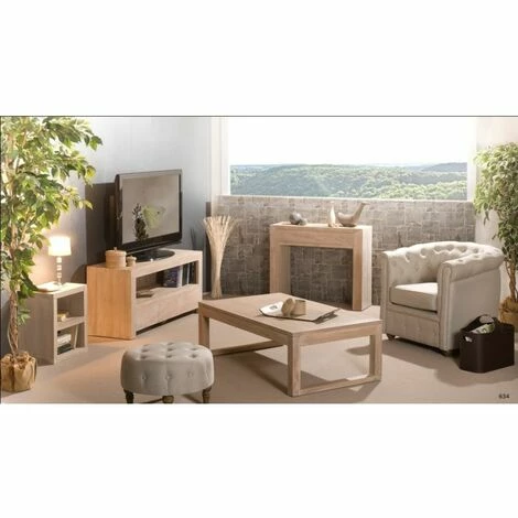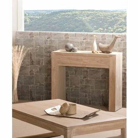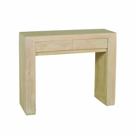 Console moderne 2 tiroirs bois teck blanchi. Dimensions : 90 x 30 x 75 cm. Article en Teck / Contreplaqué. Façonné selon tout le savoir-faire indonésien, ce meuble assure une ambiance naturelle et authentique à votre intérieur. Une très légère teinte blanche vient sublimer le teck brut. Console moderne 2 tiroirs Le teck revient en force avec un design épuré et toujours aussi chaleureux ! • Teck massif et contreplaqué teck • Meuble d’appoint à la ligne actuelle • Style et coloris exotiques Le meuble bois en teck n’a pas fini de vous séduire : on aime son charme exotique, sa chaleur et le caractère authentique du bois massif. Le meuble en teck massif investit notre intérieur en version contemporaine avec un design épuré et une touche de style colonial. Cette console 2 tiroirs marie une ligne actuelle et une matière naturelle. Elle trouvera sa place dans une pièce comme meuble d’appoint pour créer une touche d’évasion à la maison. Cette console bois exotique est réalisée en teck massif et contreplaqué teck avec une finition vernis gomme-laque. Dim.:hors tout : L90 x H75 x P30 cm. Livrée montée Entretien du Teck: Les meubles en teck brut ne nécessitent aucun entretien spécifique. Le teck est un bois très gras aux fibres très serrées qui le rend imputrescible. Meuble monté