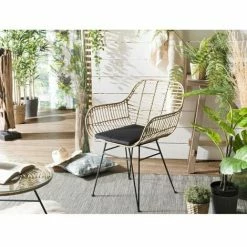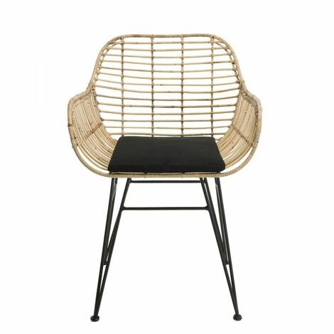 MACABANE CHLOE – Fauteuil Rotin Naturel LONG ISLAND Coussin Noir Pieds Métal – Naturel