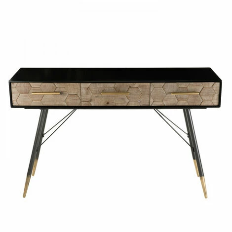 Console noire 3 tiroirs scandi bois Sapin marqueté pieds métal doré. Dimensions : 120 x 38 x 74 cm. Article en Sapin et MDF. Vous avez dit « chic », « élégante », « raffinée »… en observant cette magnifique gamme. Ce mélange de style scandinave et classique donne un caractère bien trempé à cette collection très tendance. Meuble monté, pieds à visser