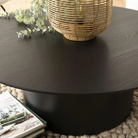 Table basse ronde noire 90x90cm piètement métal. Dimensions : 90 x 90 x 33 cm. Article en Fer/MDF plaqué chêne. Meuble monté