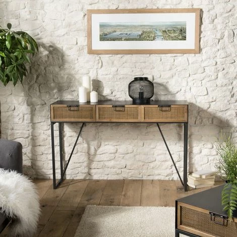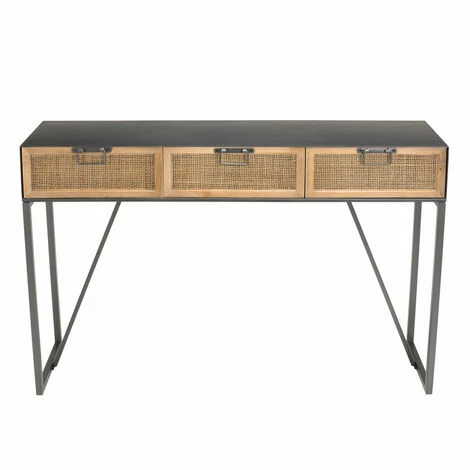 Console noire métal 3 tiroirs cannage naturel. Dimensions : 120 x 33 x 76 cm. Article en Métal et Rotin. Découvrez des meubles liant parfaitement la chaleur du bois et du cannage avec le style industriel du métal pour décorer votre intérieur avec élégance. Meuble monté, pieds à visser