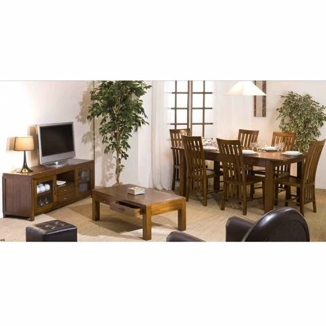 Table à manger rectangulaire marron rallonge 160/200cm bois Mindi. Dimensions : 160-200 x 90 x 79 cm. Article en Mindi et Contreplaqué. Une touche ethnique, une ligne contemporaine pour rendre l’atmosphère chaleureuse. Table de séjour à manger de séjour de style ethnique et épuré qui invite à l’évasion. Le bois prend des teintes chaleureuses avec cette table réalisée en bois exotique (Mindi) et contreplaqué, finition gomme laque (vernis). Meuble monté, pieds à visser
