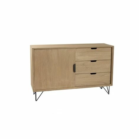 Buffet bois naturel 1 porte 3 tiroirs pieds épingles métal noir. Dimensions : 115 x 34,5 x 74,5 cm. Article en MDF et PLAQUÉ PAULOWNIA. Nous retrouvons avec plaisir l’esprit scandinave et la douceur de la finition couleur ‘chêne naturel’. La finesse des pieds métal nous emmènent tout droit dans les pays nordiques où l’ambiance chaleureuse est omniprésente. Meuble monté, pieds à visser