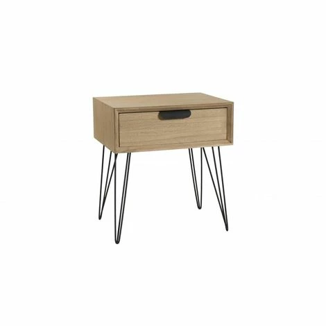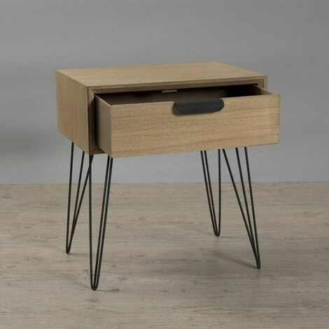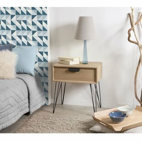 Chevet bois naturel 1 tiroir pieds épingles métal noir. Dimensions : 48 x 34 x 53 cm. Article en MDF et PLAQUÉ PAULOWNIA. Nous retrouvons avec plaisir l’esprit scandinave et la douceur de la finition couleur ‘chêne naturel’. La finesse des pieds métal nous emmènent tout droit dans les pays nordiques où l’ambiance chaleureuse est omniprésente. Meuble monté, pieds à visser
