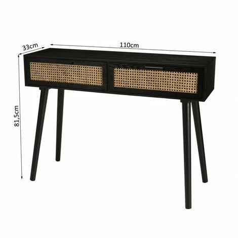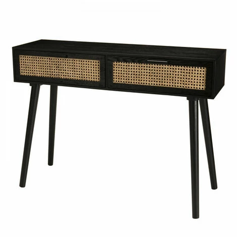 Console noire bois 2 tiroirs cannage. Dimensions : 110 x 33 x 81,5 cm. Article en Mdf plaque frêne/Rotin. Superbe collection tendance en cannage. Ce subtil mélange de bois noir et du cannage clair rend cette collection très chic et élégante. Cette jolie console composée de deux tiroirs s’adapte à votre décoration en toute circonstance…Le beau bois noir et le cannage clair sont un mélange parfait qui incarnent la modernité. Ses couleurs rendent cette collection chic et élégante. Meuble monté, pieds à visser