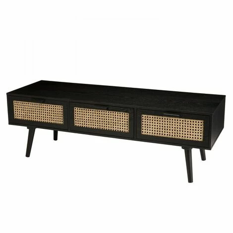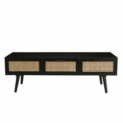 Meuble TV bois noir 3 tiroirs cannage. Dimensions : 120 x 40 x 40 cm. Article en Mdf plaque frêne/Rotin. Superbe collection tendance en cannage. Ce subtil mélange de bois noir et du cannage clair rend cette collection très chic et élégante. Ce joli meuble TV en bois et en cannage sera la pièce phare de votre salon…Ses trois tiroirs larges optimiseront votre rangement et ses teintes noires et beiges seront faciles à accorder avec votre décoration. Le rendu est très chic et élégant. Meuble monté, pieds à visser