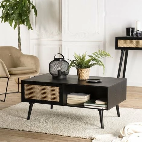 MACABANE EMILIO – Table Basse Noire Bois 2 Tiroirs Cannage 1 Niche – Naturel