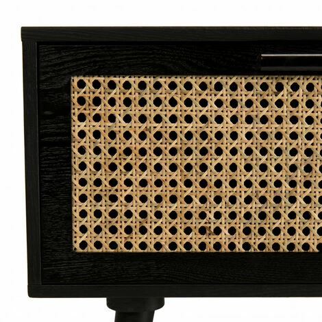 Table basse noire bois 2 tiroirs cannage 1 niche. Dimensions : 100 x 60 x 44,5 cm. Article en Mdf plaque frêne/Rotin. Superbe collection tendance en cannage. Ce subtil mélange de bois noir et du cannage clair rend cette collection très chic et élégante. Cette magnifique table basse est totalement dans l’air du temps. Ses deux tiroirs et sa niche vous permettront de ranger convenablement vos objets. Ce joli bois noir et ce cannage clair créent un subtil mélange et la rende chic et élégante à la fois. Meuble monté, pieds à visser