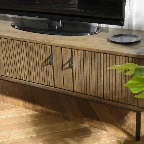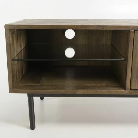 Meuble TV marron 2 portes 1 niche Acacia pieds métal noir. Dimensions : 160 x 45 x 50.5 cm. Article en Acacia/MDF plaqué acacia/Acier. Ce meuble TV fabriqué en bois d’acacia apportera un côté chaleureux à votre pièce. Sa jolie teinte marron mettra forcément votre télé en valeur pour que vous puissiez apprécier vos soirées sur le canapé. Doté de 2 portes et 1 niche, vous pourrez optimiser votre rangement comme vous le souhaitez. Meuble monté, pieds à visser