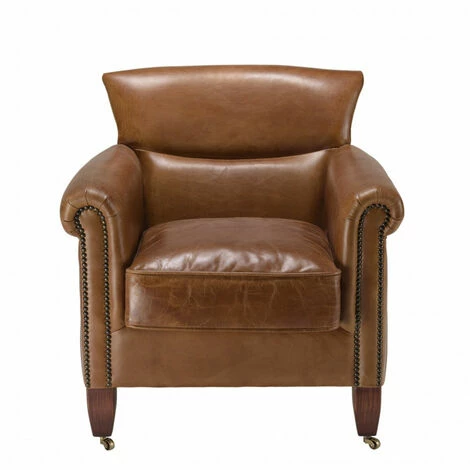 Fauteuil marron VERONE vintage cuir pieds bois avec roulettes. Dimensions : 73 x 83 x 78 cm. Article en Cuir de vache / Mousse / Contreplaqué / Chêne / Acier. Appréciez vos moments de détente dans ce fauteuil VERONE rétro en cuir marron. Son dossier haut et ses larges accoudoirs rendent l’assise agréable. Doté de surpiqûres en métal sur le devant, il apportera du cachet à votre pièce. Dans un salon, un bureau ou une chambre, sa couleur se mariera avec de nombreux styles de décoration. Ses quatre roulettes sont pratiques et vous permettent de le déplacer facilement et autant de fois que vous le voudrez. Meuble monté