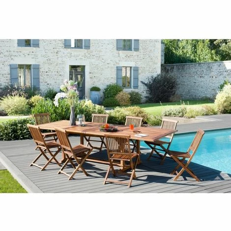 Salon de jardin en bois 10/12 personnes. Dimensions : 45 x 60 x 90 cm/200 x 120 x 75 cm. Articles en teck huilé. LOT COMPRENANT : 1 table rectangulaire 200*300/120 cm référence 501180 – 4 lots de 2 chaises java 501194 Ce magnifique salon de jardin en teck vous donnera envie de profiter de votre extérieur et du soleil. La teinte du teck huilé est parfaite pour l’été. Cette ensemble vous permettra d’accueillir famille et amis afin de passer des moments agréables et conviviaux. Il est fortement conseillé d’abriter ce mobilier et de le protéger du gel pendant la période hivernale afin qu’il ne s’abîme pas. Les meubles en teck de cette collection sont légèrement teintés, pour leur donner une couleur miel. Pour conserver la couleur initiale de votre meuble, poncez légèrement ce dernier avec un papier de verre fin. Vous pouvez également appliquer une huile de teck en début de saison, il sera ainsi protégé et conservera sa teinte miel. Le teck est un bois précieux et imputrescible très utilisé pour la fabrication de meubles de jardin car il est extrêmement résistant aux agressions climatiques les plus rudes et constantes (humidité). Les plantations Le bois utilisé dans la fabrication de nos meubles de jardin provient uniquement de forêts de replantation provenant de l’île de Java. Ces forêts sont gérées par l’organisme d’état Perum Perhutani, qui détermine une saisonnalité et un quota de coupe afin d’assurer la durabilité de la ressource. L’entretien Les meubles en teck peuvent rester à l’extérieur sans aucun traitement particulier. Après quelques mois voire quelques années, le bois prendra une teinte grisée. Pour conserver la couleur initiale de votre meuble ou pour retirer une tache, poncez légèrement ce dernier avec un papier de verre fin. Vous pouvez également appliquer une huile de teck en début de saison, il sera ainsi protégé et de couleur miel. Il est fortement conseillé d’abriter ce mobilier et de le protéger du gel pendant la période d’hiver afin qu’il ne s’abîme pas. Meuble monté, pieds à visser