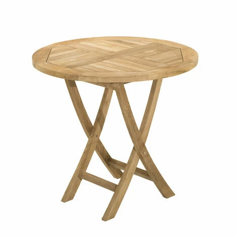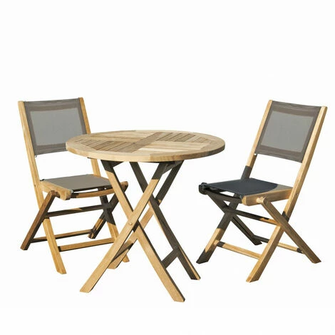 Salon de jardin en bois 2 personnes. Dimensions : 80 x 80 x 75 cm. Articles en teck brut et textilène couleur taupe. LOT COMPRENANT : 1 table ronde pliante 80*80cm référence 500984 – 1 lot de 2 chaises pliantes textilène couleur taupe référence 501214 Ce magnifique salon de jardin en teck vous donnera envie de profiter de votre extérieur et du soleil. Les teintes douces et rafraîchissantes du teck se marient très bien au tissu de ces 2 chaises pliantes et sont parfaites pour l’été. Cet ensemble vous permettra de passer des moments agréables et conviviaux. Le teck est un bois précieux et imputrescible très utilisé pour la fabrication de meubles de jardin car il est extrêmement résistant aux agressions climatiques les plus rudes et constantes (humidité). Nos meubles de jardin sont en teck massif de première qualité, ce qui exclut principalement les défauts et offre une finition qualitative. Les plantations Le bois utilisé dans la fabrication de nos meubles de jardin provient uniquement de forêts de replantation provenant de l’île de Java. Ces forêts sont gérées par l’organisme d’état Perum Perhutani, qui détermine une saisonnalité et un quota de coupe afin d’assurer la durabilité de la ressource. L’entretien Les meubles en teck peuvent rester à l’extérieur sans aucun traitement particulier. Après quelques mois voire quelques années, le bois prendra une teinte grisée. Pour conserver la couleur initiale de votre meuble ou pour retirer une tache, poncez légèrement ce dernier avec un papier de verre fin. Vous pouvez également appliquer une huile de teck en début de saison, il sera ainsi protégé et de couleur miel. Il est fortement conseillé d’abriter ce mobilier et de le protéger du gel pendant la période hivernale afin qu’il ne s’abîme pas. Meuble monté