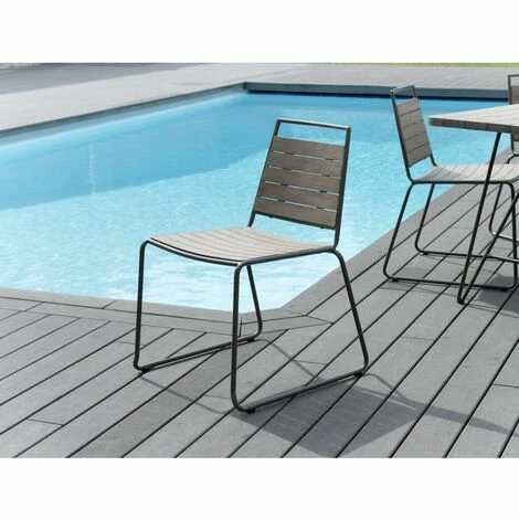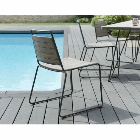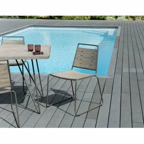 Lot de 2 chaises de jardin en bois. Dimensions : 55 x 63 x 81 cm. Articles en teck teinté grisé et métal. Pour votre jardin, craquez pour ces chaises de jardin originales empilables en teck teinté grisé. Leur aspect moderne et design saura se démarquer et leur assise confortable est parfaite pour passer de longs moments au soleil. Ces meubles vous permettront de pleinement profiter de votre extérieur. Les meubles en teck de cette collection sont légèrement teintés, pour leur donner une couleur gris clair. Pour les nettoyer, vous pourrez utiliser un chiffon doux légèrement humide. Le teck est un bois précieux et imputrescible très utilisé pour la fabrication de meubles de jardin car il est extrêmement résistant aux agressions climatiques les plus rudes et constantes (humidité). Les plantations Le bois utilisé dans la fabrication de nos meubles de jardin provient uniquement de forêts de replantation provenant de l’île de Java. Ces forêts sont gérées par l’organisme d’état Perum Perhutani, qui détermine une saisonnalité et un quota de coupe afin d’assurer la durabilité de la ressource. Il est fortement conseillé d’abriter ce mobilier et de le protéger du gel pendant la période hivernale afin qu’il ne s’abîme pas. Meuble monté