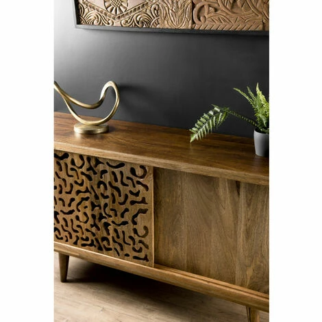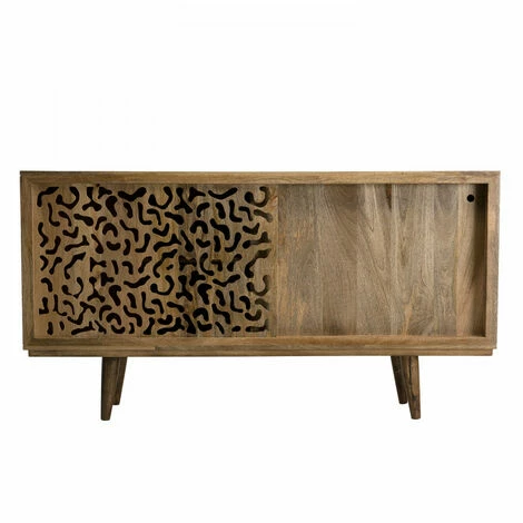 Buffet Manguier 160x45cm 2 portes coulissantes 1 étagère Jaipur. Dimensions : 160 x 45 x 85 cm. Article en Manguier et contre plaqué (arrière). Esprit typiquement indien qui dépaysera votre salon. Un mélange harmonieux entre chaleur du manguier et les motifs orientaux. Meuble monté, pieds à visser