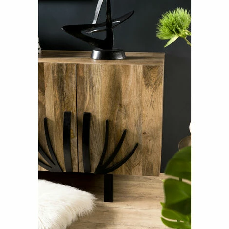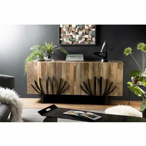 Buffet bois Manguier 177x45cm 4 portes 2 étagères déco branches pieds métal Bangalore. Dimensions : 177 x 45 x 79 cm. Article en Manguier et contre plaqué (arrière). Esprit typiquement indien qui dépaysera votre salon. Un mélange harmonieux entre chaleur du manguier et les motifs orientaux. Meuble monté, pieds à visser