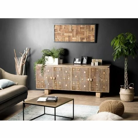 Buffet bois Manguier 177x45cm 4 portes 2 étagères motifs noirs Goa. Dimensions : 177 x 45 x 75 cm. Article en Manguier et contre plaqué (arrière). Esprit typiquement indien qui dépaysera votre salon. Un mélange harmonieux entre chaleur du manguier et les motifs orientaux. Meuble monté, pieds à visser
