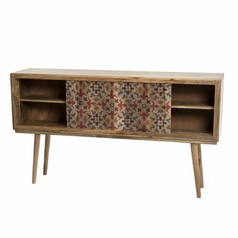 Console bois Manguier 160x35cm 2 portes coulissantes 1 étagère Bhoutan. Dimensions : 160 x 35 x 90 cm. Article en Manguier et contre plaqué (arrière). Esprit typiquement indien qui dépaysera votre salon. Un mélange harmonieux entre chaleur du manguier et les motifs orientaux. Meuble monté, pieds à visser