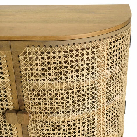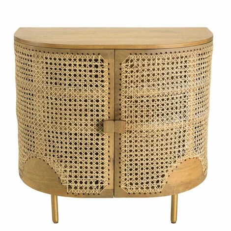 Buffet marron 2 portes bois de manguier et cannage pieds métal doré. Dimensions : 81 x 45.5 x 75.5 cm. Article en Manguier/Rotin/Acier/Contreplaqué. Imaginez ce buffet naturel 2 portes chez vous… Sa forme arrondie est totalement dans l’air du temps et rend ce meuble original. Petit mais pratique, il possède 2 étagères qui permettent un rangement optimal. Ce meuble est doté de 4 pieds en métal doré qui apportent une petite touche chic. Meuble monté, pieds à visser