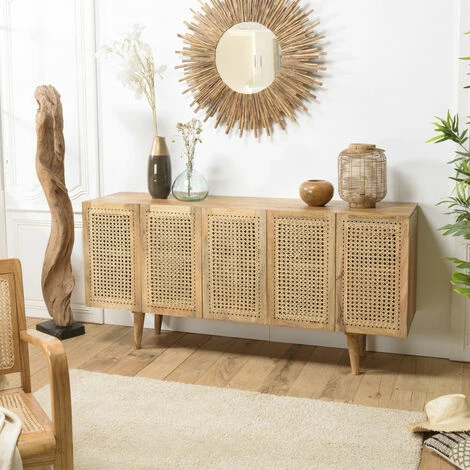 Buffet marron 5 portes bois de manguier et cannage couleur naturelle. Dimensions : 177 x 45.5 x 85 cm. Article en Manguier/Rotin/Contre plaqué. Craquez pour ce joli buffet design en bois de manguier et rotin. Il incarne totalement le style bohème et ethnique grâce à ses jolies matières naturelles. Composé de 5 portes, ses dimensions sont idéales pour le customiser selon vos goûts et y ranger vos objets comme vous le souhaitez. Meuble monté, pieds à visser