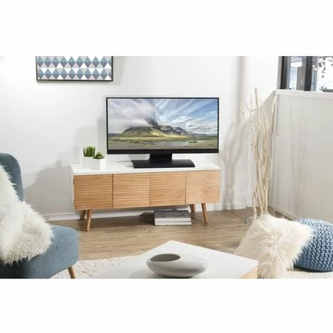 Meuble TV 4 portes bois clair et blanc. Dimensions : 120 x 40 x 48 cm. Article en MDF et pin. Style 100% scandinave qui nous donne envie de changer d’univers pour une ambiance claire et chaleureuse… Meuble monté, pieds à visser
