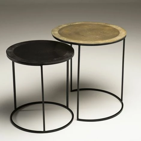Set de 2 tables d’appoint gigognes rondes aluminium dorĂ© et noir – pieds ronds mĂ©tal noir. Dimensions : 48,5 x 48,5 x 52 cm. Article en Aluminium et MĂ©tal. Collection indĂ©finissable tellement elle resplendit par la noblesse de sa matière. En un clin d’Ĺ“il, cette gamme aux allures orientales illuminera votre intĂ©rieur avec sa couleur dorĂ©e et argentĂ©e. Ces superbes tables d’appoint noire et dorĂ©e sont très chics et Ă©lĂ©gantes Ă la fois. Ce set vous permet de les disposer l’une Ă cĂ´tĂ© de l’autre ou bien sĂ©parĂ©es comme vous le souhaitez… Elles donneront un petit cĂ´tĂ© original Ă votre pièce grâce Ă leurs pieds en mĂ©tal asymĂ©triques et leur cerclage texturĂ© au niveau du plateau. Meuble montĂ©