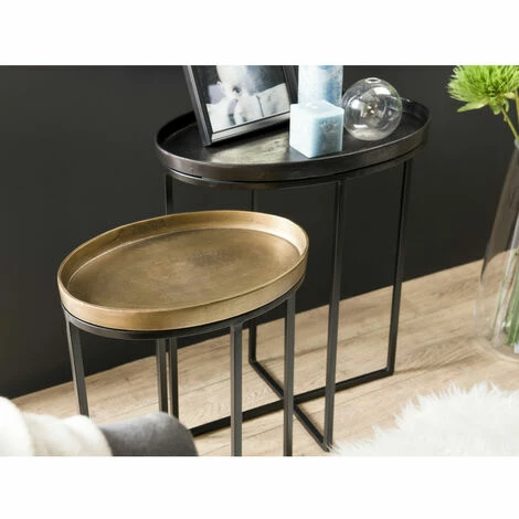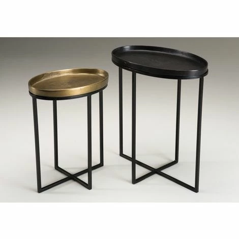 Set de 2 tables d’appoint ovales aluminium doré et noir – pieds métal noir. Dimensions : 47,5 x 30,5 x 56 cm. Article en Aluminium et Métal. Collection indéfinissable tellement elle resplendit par la noblesse de sa matière. En un clin d’œil, cette gamme aux allures orientales illuminera votre intérieur avec sa couleur dorée et argentée. Ces petites tables d’appoint ovales dorées et noires vont donner de l’allure à votre maison. Vous pourrez les dissocier ou bien les mettre à côté pour y disposer vos affaires indispensables. Les pieds croisés en métal artisanal et les plateaux en aluminium vont forcément vous séduire… Meuble monté